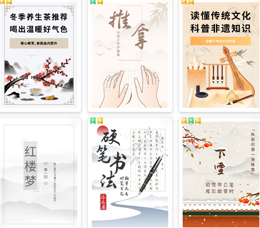 传统文化类内容:用于传播诗词、讲解国画、解析汉字文化的内容,浓浓的水墨风让人一秒置身古意盎然的环境中。