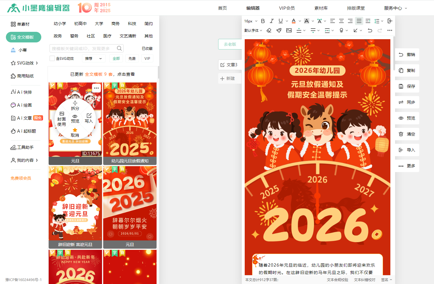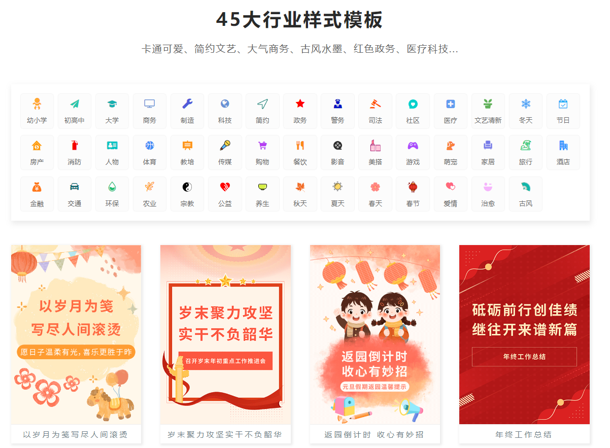 海量素材库:25万+单素材、10000+全文模板覆盖45个行业场景