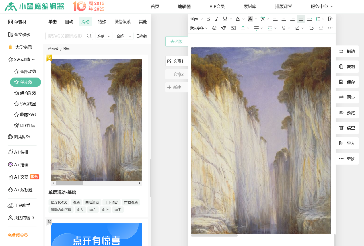 如果感觉静态图片太单调,没有趣味性,想让文章互动性更强更有意思,那svg滑动图片绝对要试一下。今天来聊一下这种炫酷的效果是怎么制作的,首先我们需要有一个第三方公众号文章排版工具,这里首推小墨鹰编辑器,SVG动效制作效果是最好学的,非常简单,对于新手来说使用难度大大降低。