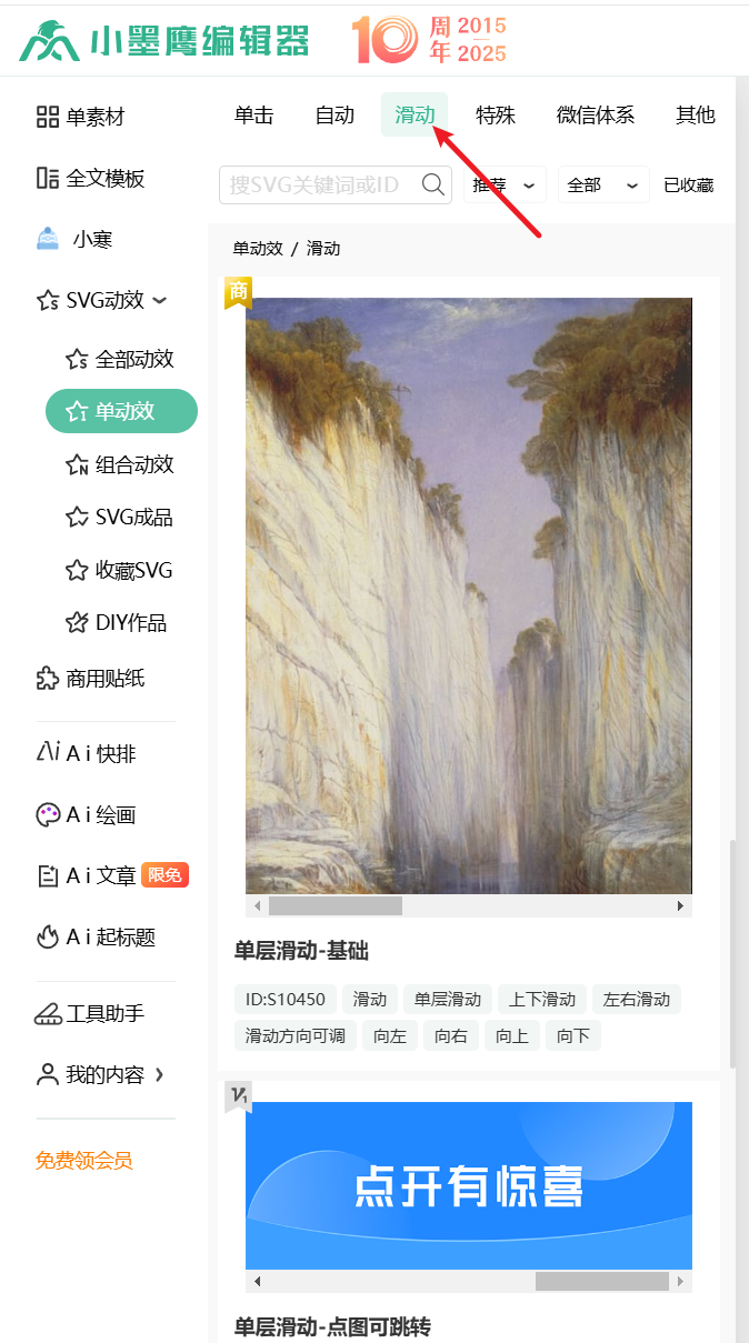 首先,点击小墨鹰编辑器左侧分类中的【svg动效】按钮,在出现的页面中点击【滑动】