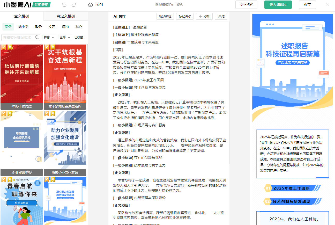 新手建议选择操作逻辑清晰且功能全面的工具,比如小墨鹰编辑器。它支持全自动排版,即使是毫无经验的新手也能轻松上手,导入文档后即得精美成果。此外,海量模板库能让新手在各种场景下都找到合适素材,真正做到简洁高效。