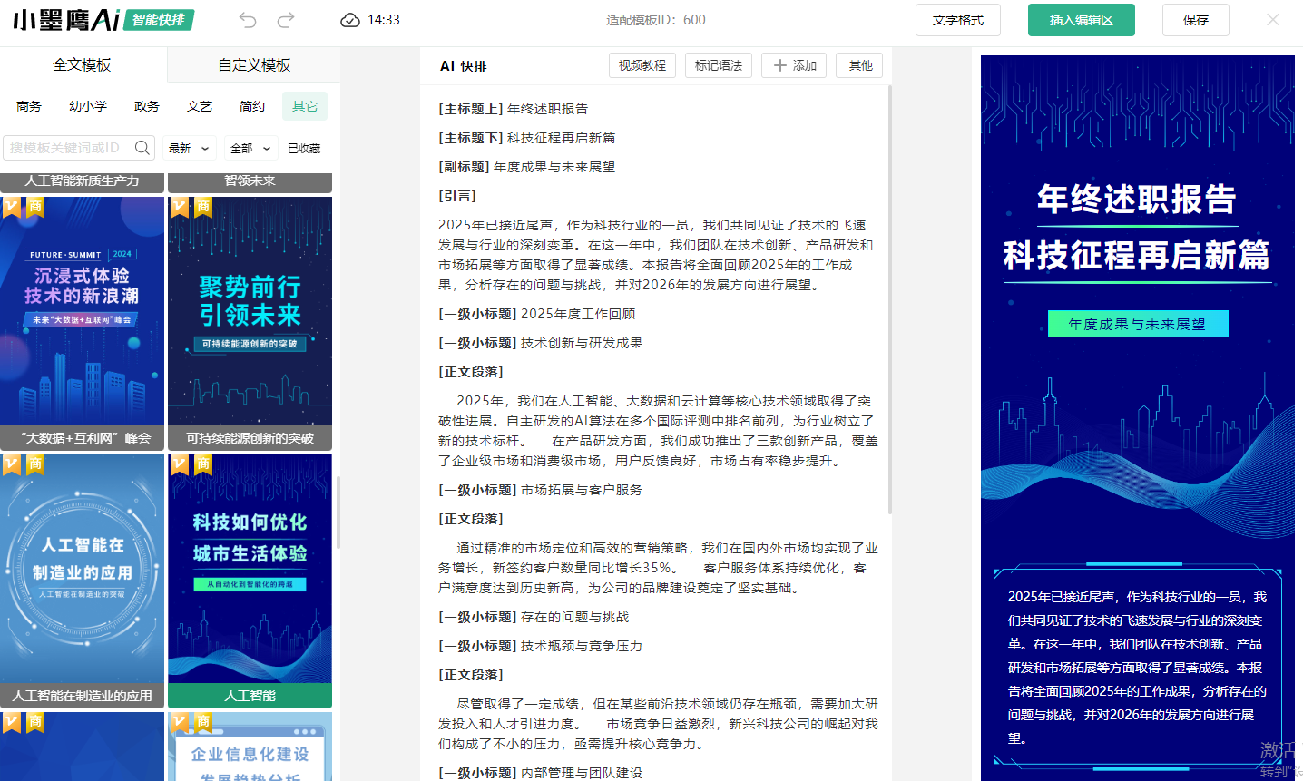 超前行业领先水准:率先打造 AI自动排版,无需人工干预即可完成从文档导入到模板套用的全过程。