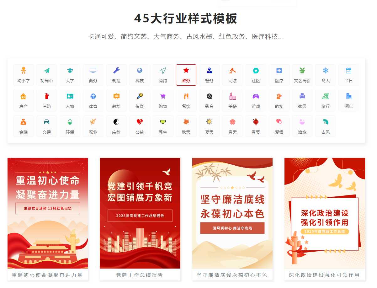 海量模版库 25万+素材单元、10000+全文模板、3000+动效素材,覆盖企业从宣传到总结的各种场景。