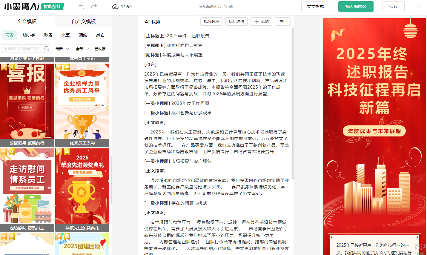 小墨鹰编辑器首创AI快排功能,从文档导入到精致排版仅需30秒,无需任何手动调整。不论是公司年会总结、产品介绍还是活动推广,AI算法会自动识别文章结构,智能匹配最佳版式。比如导入一篇关于年终活动的总结报告,AI会智能区分标题、小结、图片段落及二维码区域,生成大气、专业的排版效果,将员工的繁琐工作量压缩至最低,为其他创意工作释放更多时间。