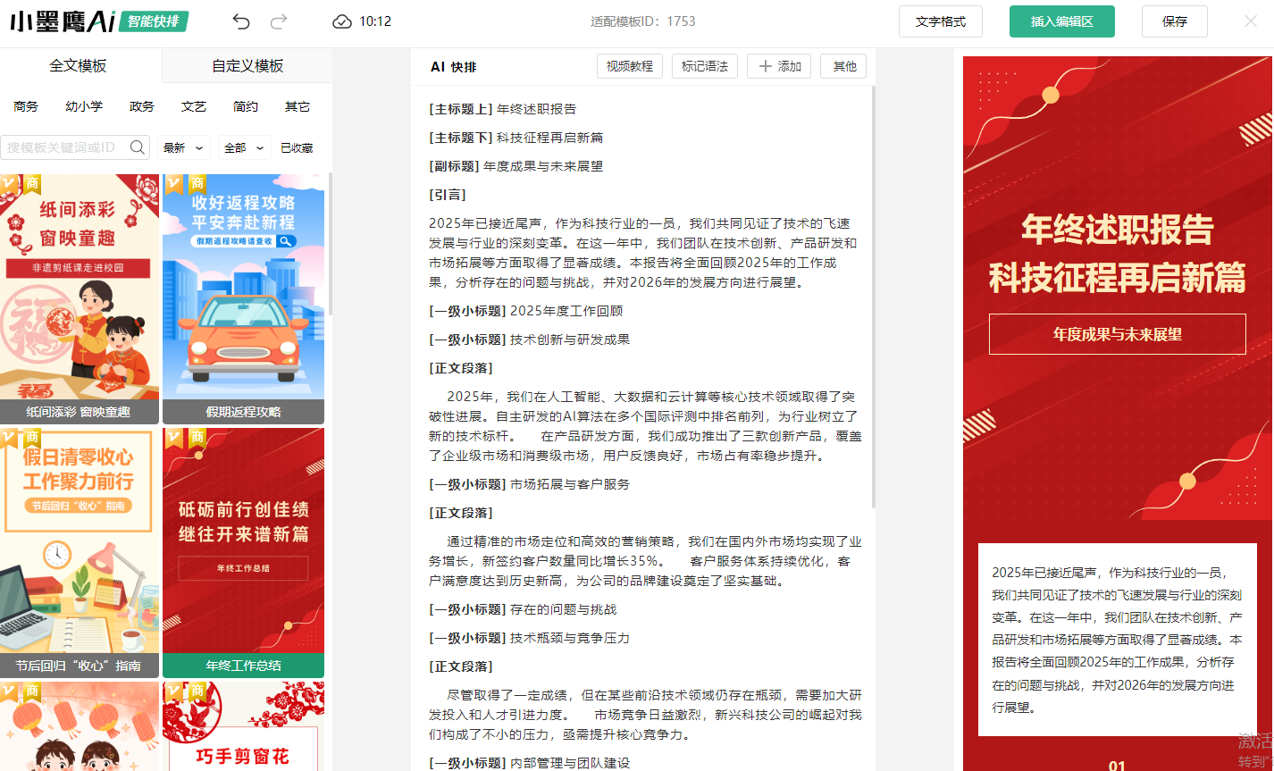 新手应优先选择拥有优质模板、操作直观的工具。小墨鹰编辑器提供了丰富的25万素材库、模板日更新功能,新手只需尝试一次便能立即上手,节省学习成本。