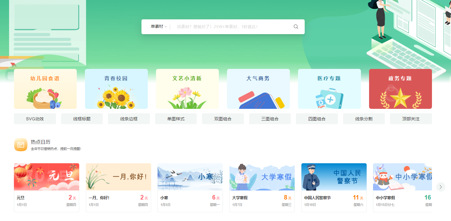 海量高质量素材:拥有25万+图文素材、10000+行业专项模板,涵盖政务、教育、科技、医疗等45大行业,还提供** 3000+SVG动效**,大大扩展了内容呈现的创意边界。