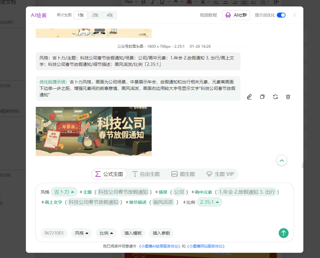 AI绘画有很多模式,「公式生图、自由生图、图生图」,不得不说,小墨鹰的设计者也蛮有趣的。