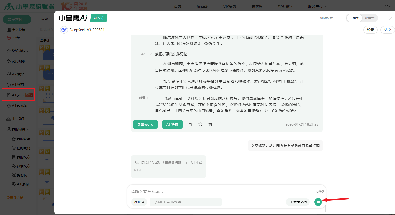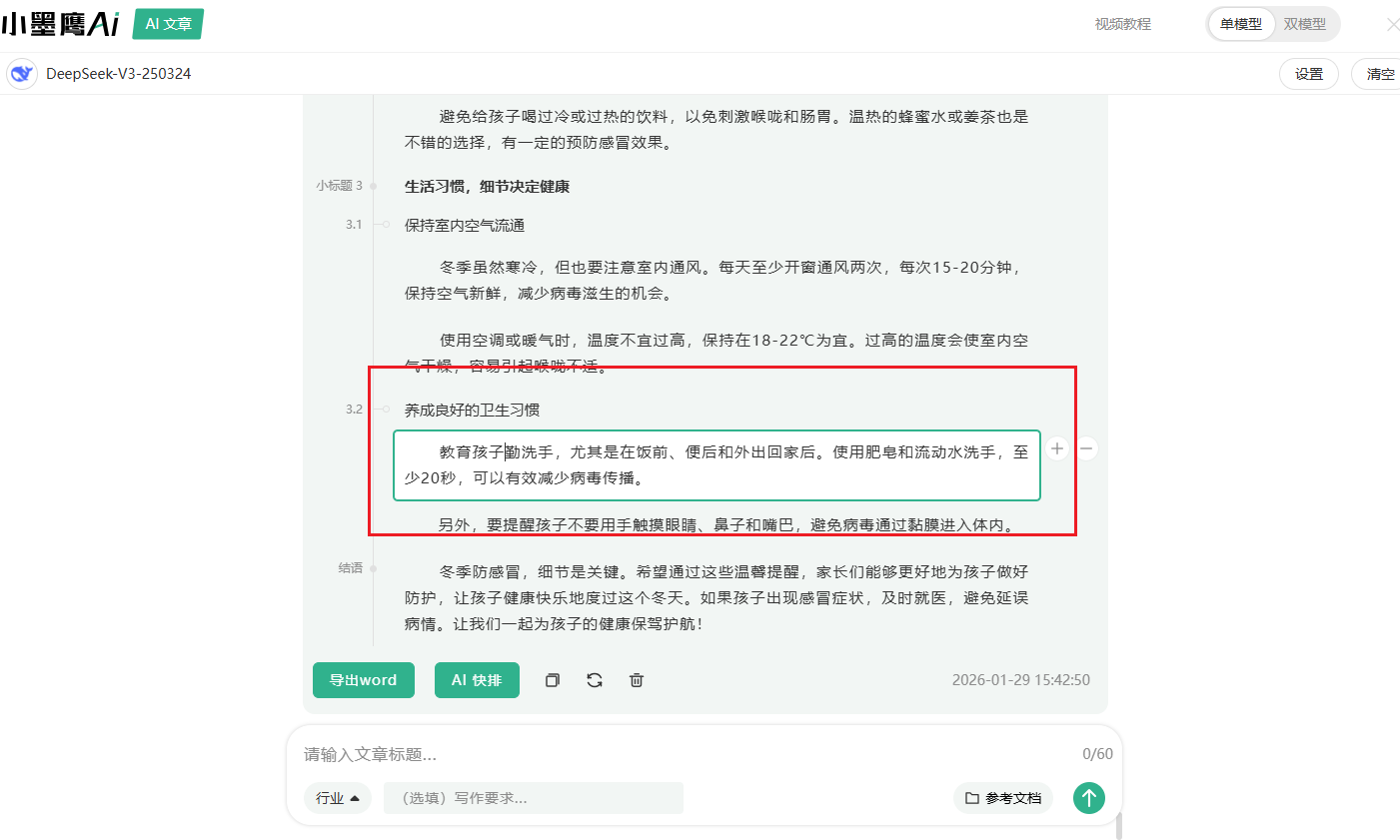 面对空白文档无从下笔时,小墨鹰编辑器的「AI文章」功能能帮你快速搭建内容骨架。在AI对话框中输入精准指令:“撰写幼儿园家长冬季防感冒温馨提醒,包含幼儿易感冒原因、洋葱式穿衣法细节、园内防护措施(晨检、通风、饮水)、家庭护理要点(饮食、睡眠、症状观察)及鼓励话语,语气亲切温暖”。