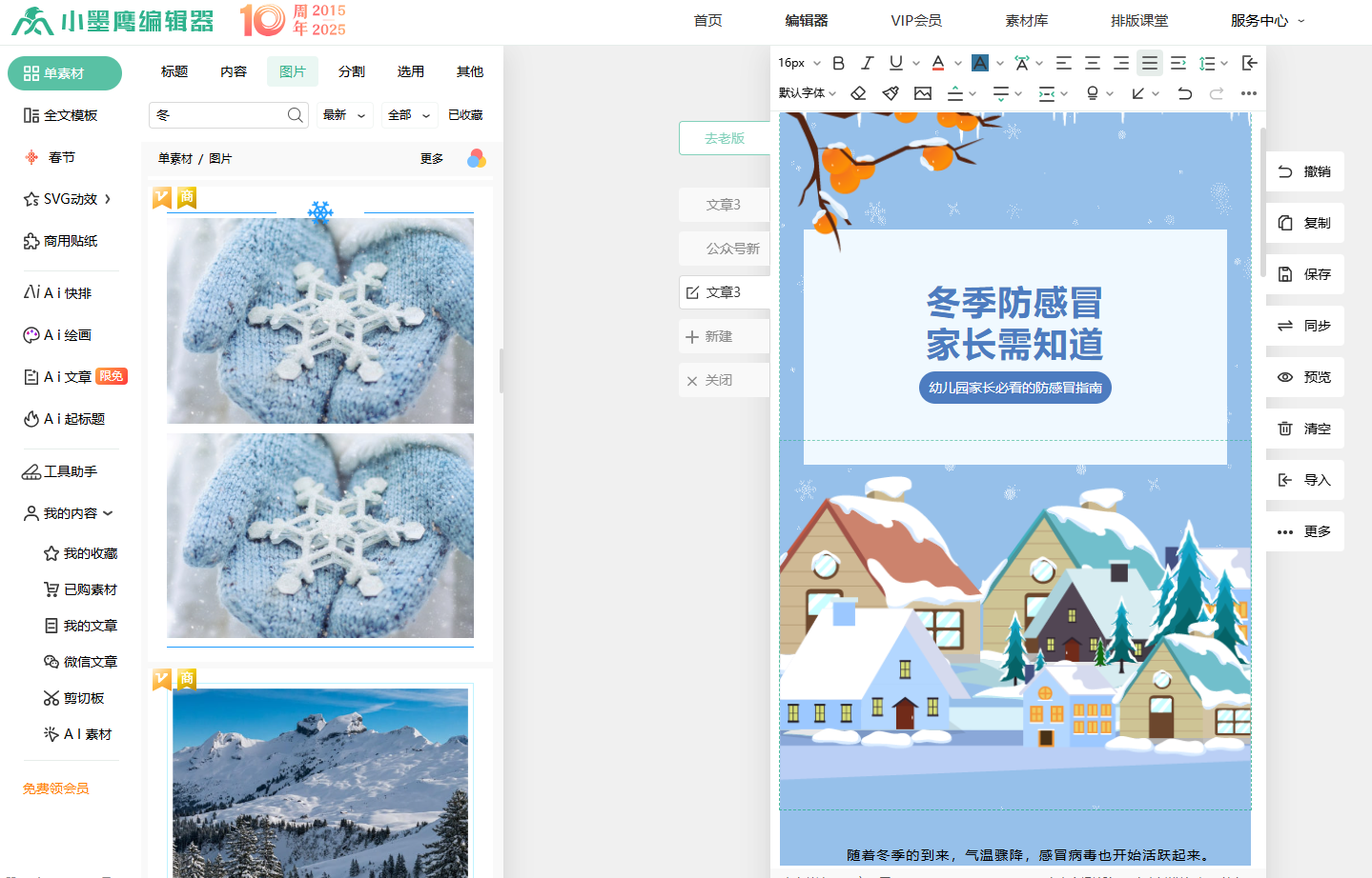 冬天寒意渐浓,幼儿免疫力较弱,感冒风险升高,孩子们的健康始终牵动着幼儿园与家长的心。一份优质的冬季防感冒提醒,不应只是简单通知,更该是科学实用、充满温度的家园共育指南 —— 既要有可操作的方法,又能传递园所关怀。借助小墨鹰编辑器,三步就能高效完成这份贴心提醒,让家长愿意收藏、主动配合。