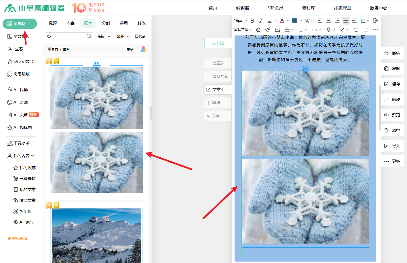 素材点缀:搜索 “冬天”“儿童”“保暖” 等关键词,挑选可爱的卡通围巾、帽子、热水杯、太阳图标,穿插在段落中,增添童趣;