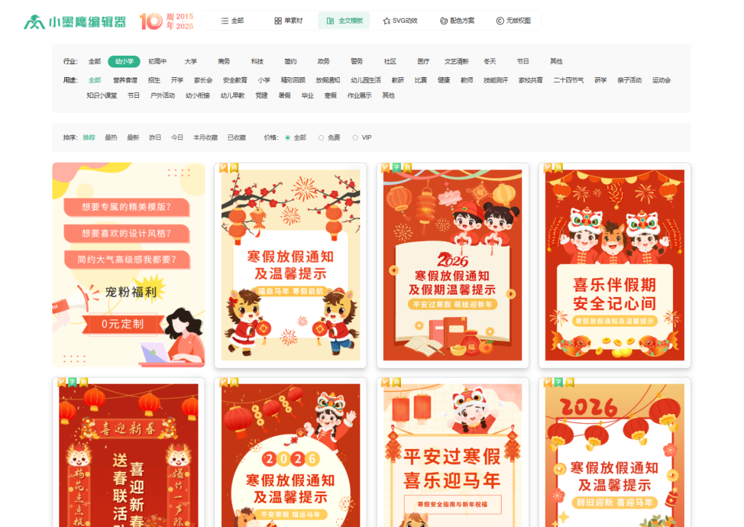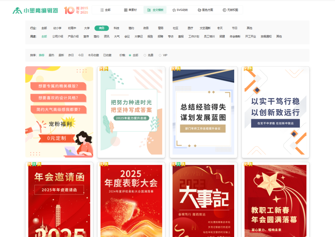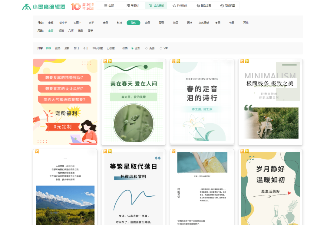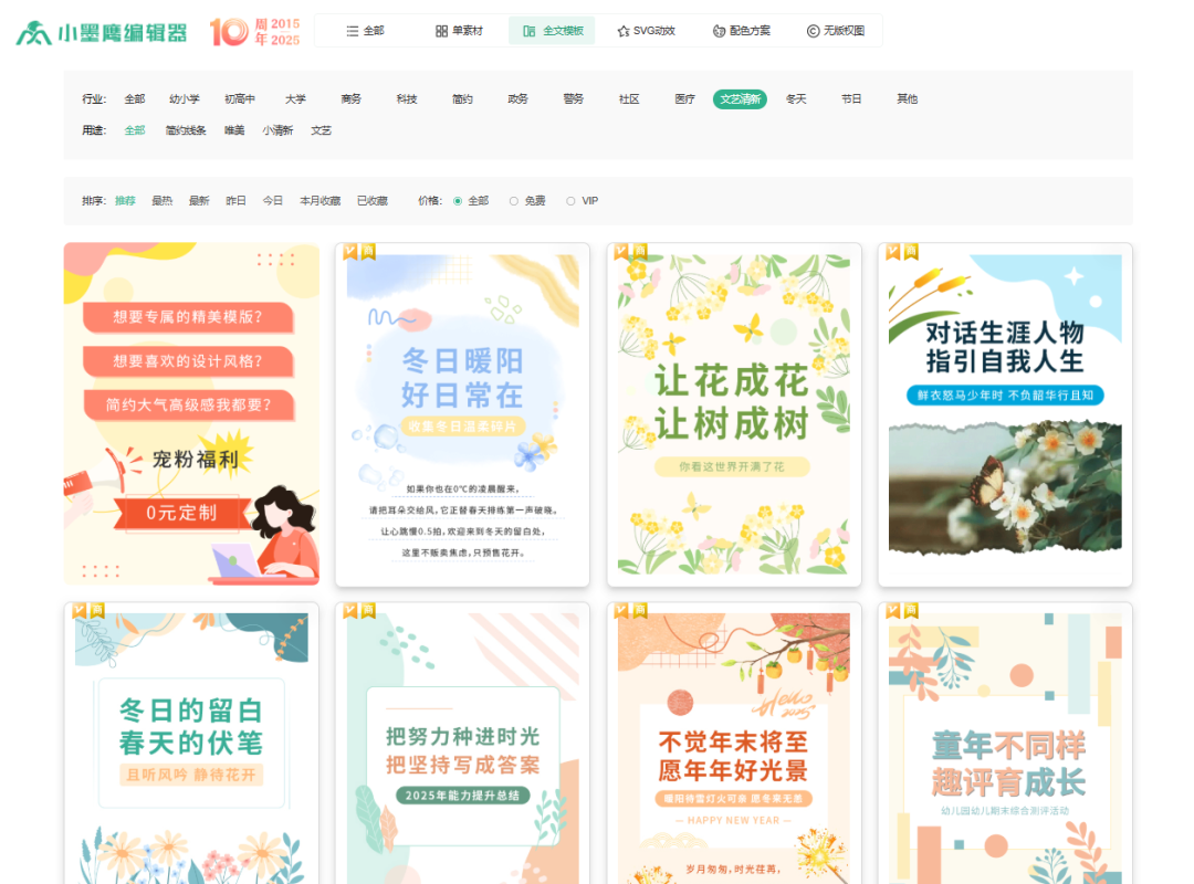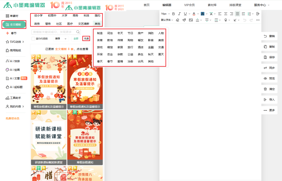 小墨鹰编辑器是我一直在用的第三方微信编辑器,它的模板库按风格和场景分类很清楚,无论是日常推文还是节日专题,都能快速定位。选择喜欢的模板后,一键套用就能获得完整的排版框架,只需要替换文字和图片即可。而且它的模板素材每日都会更新哦,免费素材模板也很多。