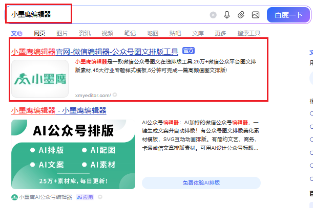 第一步:在浏览器搜索公众号编辑器,打开小墨鹰编辑器官网(https://www.xmyeditor.com/)