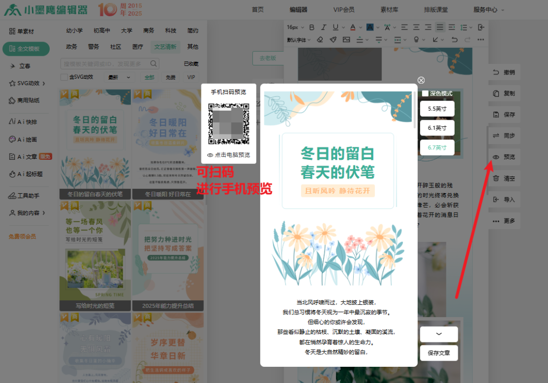 第四步:编辑完成后,一定别忘了预览!点击“预览”按钮,看看文章在手机上的显示效果,及时调整不美观的地方。