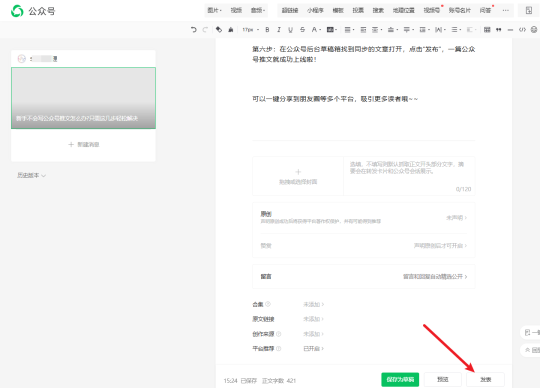 第六步:在公众号后台草稿箱找到同步的文章打开,点击“发布”,一篇公众号推文就成功上线啦!