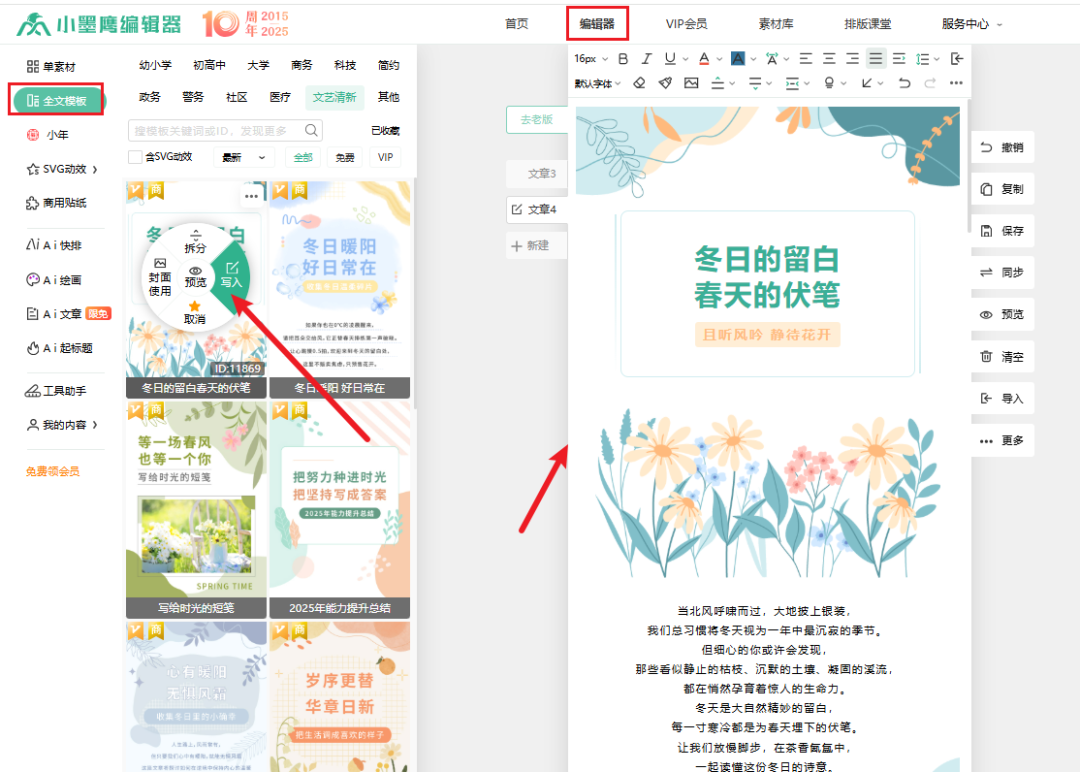 第二步:进入小墨鹰编辑页面,提供了超多精美的模板,各行各业、总有一款适合你。选择一款你喜欢的模板,点击“写入”进行编辑使用模板。
